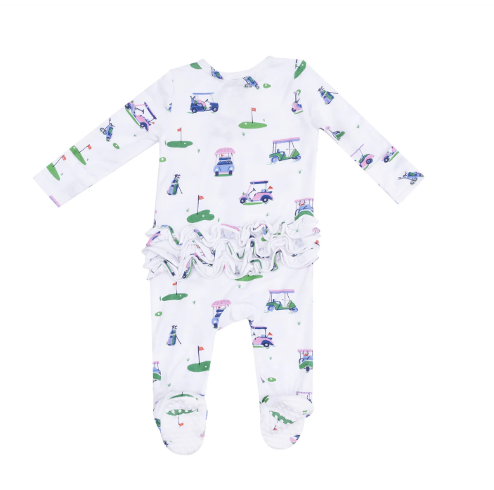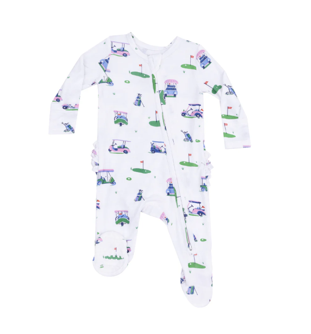2 Way Zipper Ruffle Back Footie - Vintage Golf Carts Pink