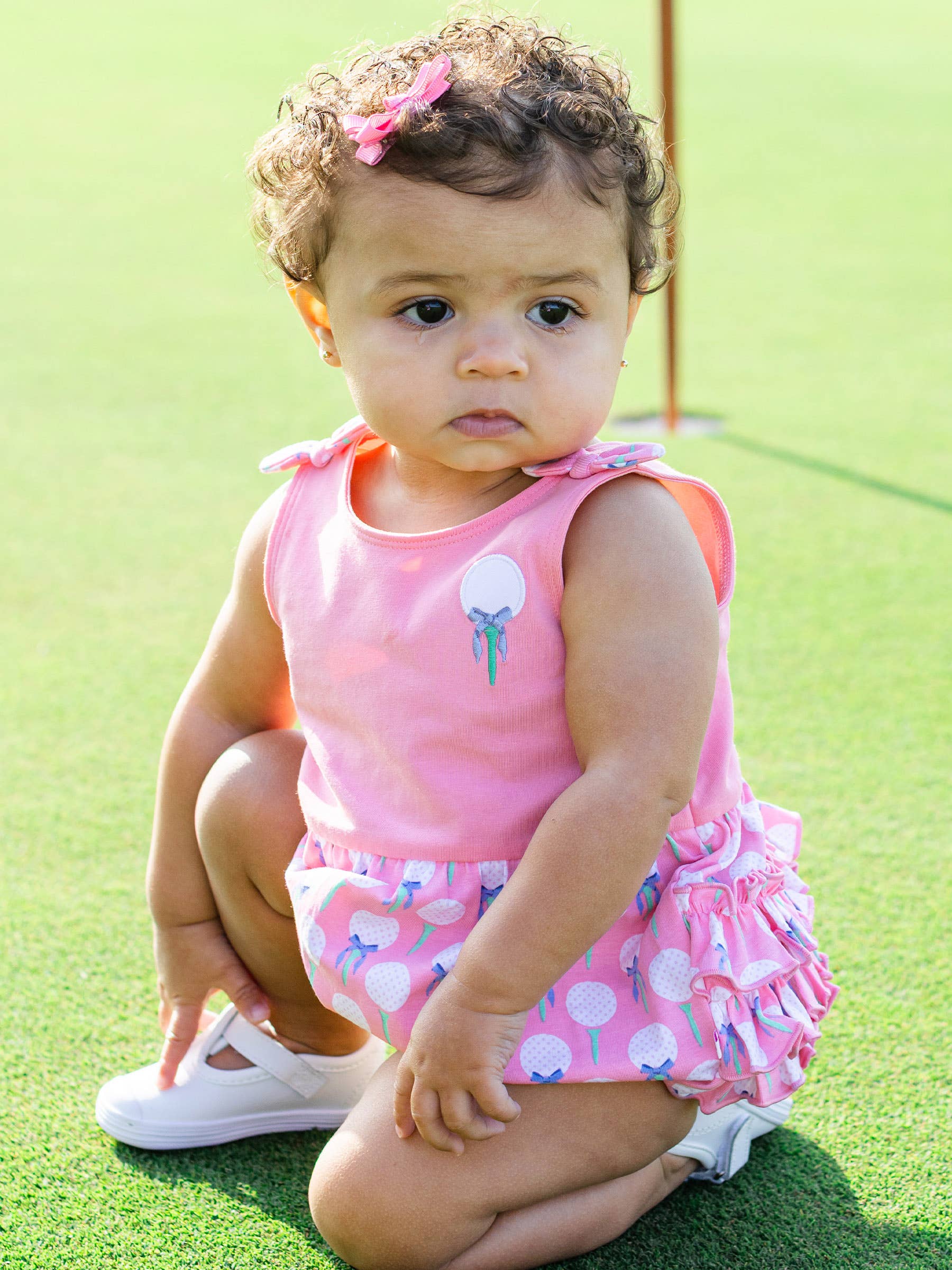 Crafted from soft and breathable knit fabric, this romper combines comfort with a playful silhouette, making it a perfect choice for playdates or park days. Signature rear ruffles and decorate tie shoulders add a special touch, and snaps at the legs make changing easy. Golf balls and tiny tees are adorned with sweet bows in this fun and preppy print!