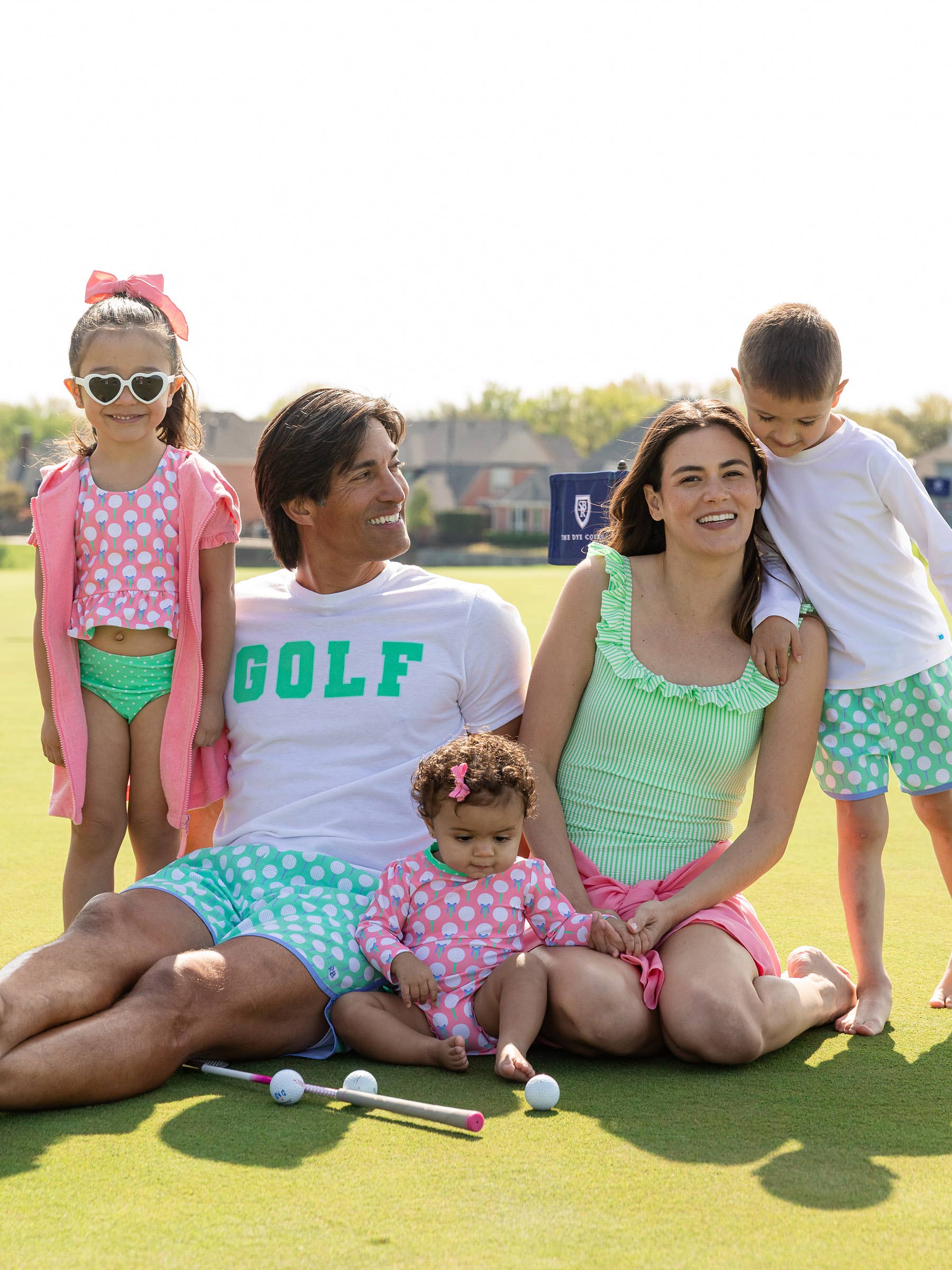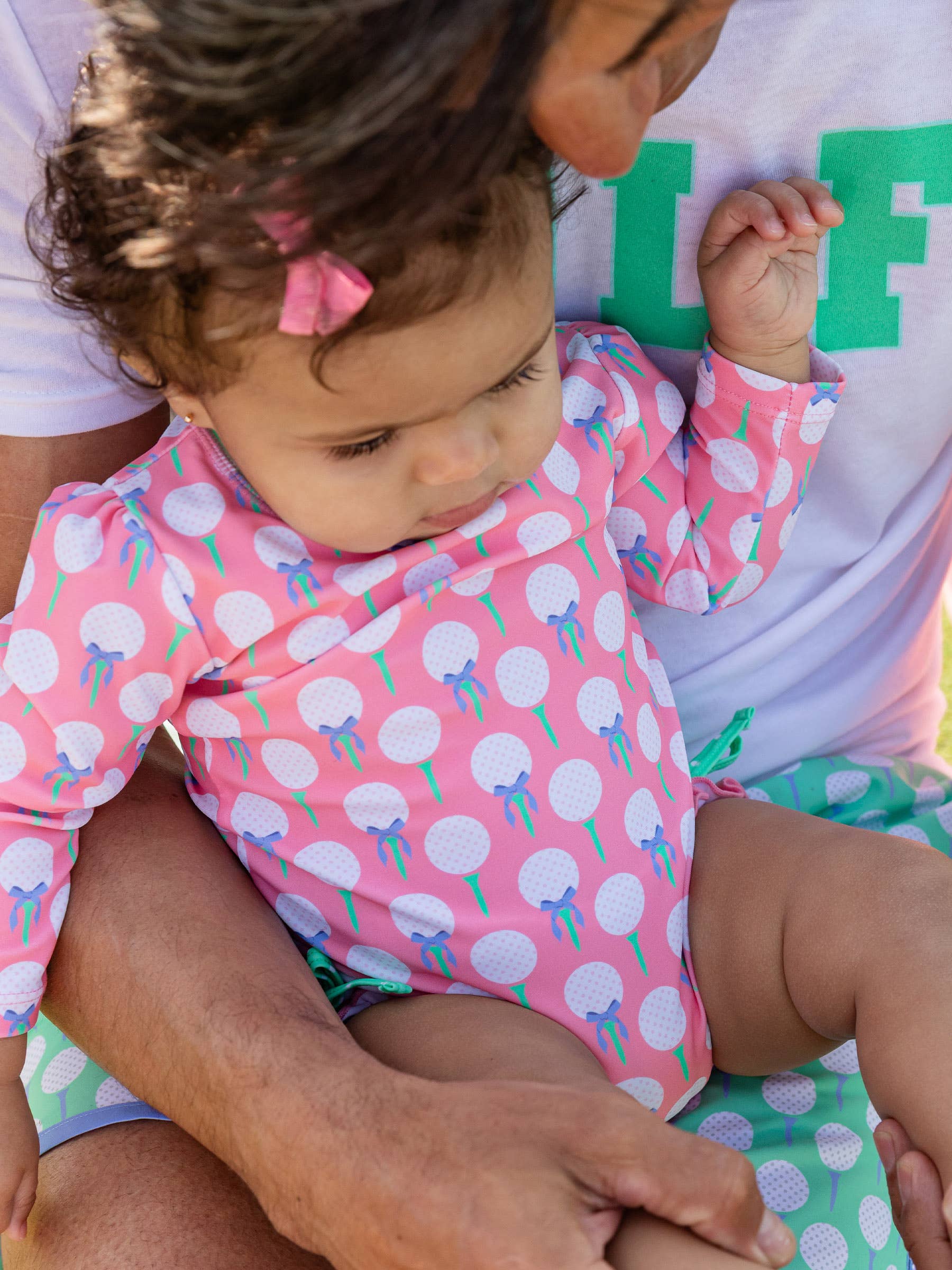 A wonderful addition to your little girl's swimwear, this One Piece Rash Guard is comfort and style rolled into one. Unlined with snaps at bottom that make for easy changing. Made with sun protected fabric for all day protection and comfort. Golf balls and tiny tees are adorned with sweet bows in this fun and preppy print! Pairs perfectly with the Bubblegum Pink Hat.