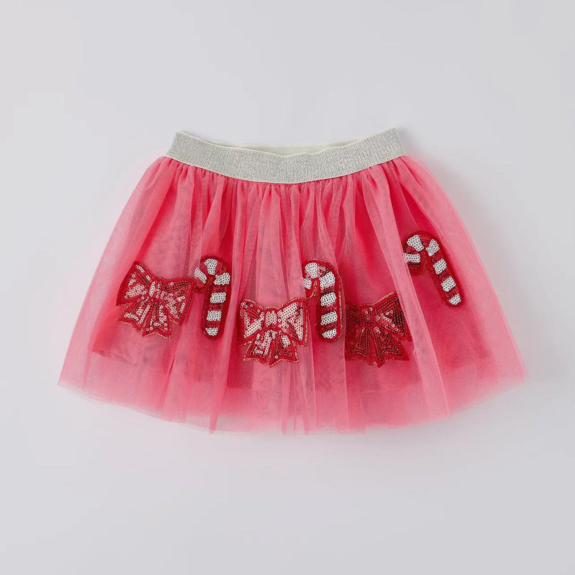 Celebrate the festive season in style with our Christmas Candy Cane and Bows Sequin Applique Pink Tulle Skirt. Featuring shimmering candy cane sequins on pink tulle, this skirt brings holiday cheer to any outfit. Its light, airy design ensures comfortable movement, perfect for holiday parties and joyful gatherings. Add a touch of sparkle and charm to your wardrobe that captures the magic of Christmas.