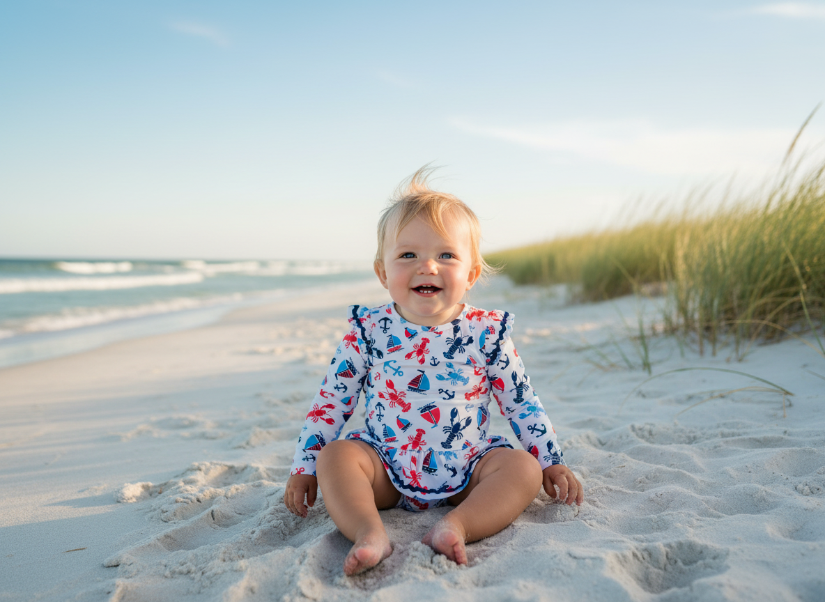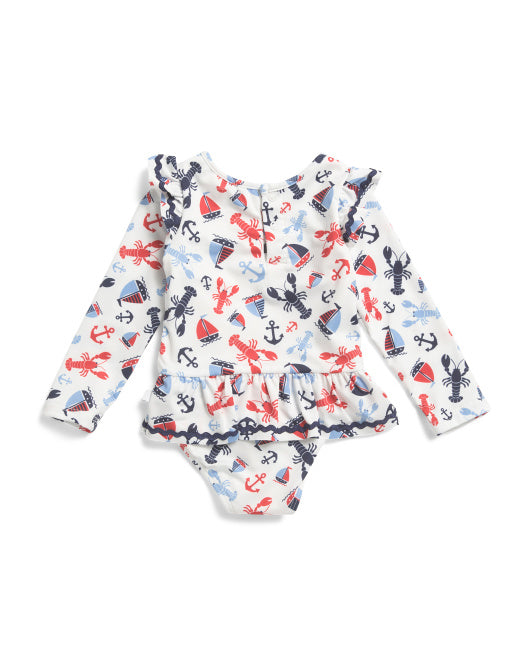 This charming one-piece swimsuit combines sun protection with playful coastal style. Crafted from a stretchy polyester and spandex blend, it features long sleeves, a crew neck, and a sweet ruffle accent for added dimension. The back button closure and snap button gusset ensure a secure, comfortable fit for active water play. Matching sunglasses complete the look. Hand wash to maintain quality.