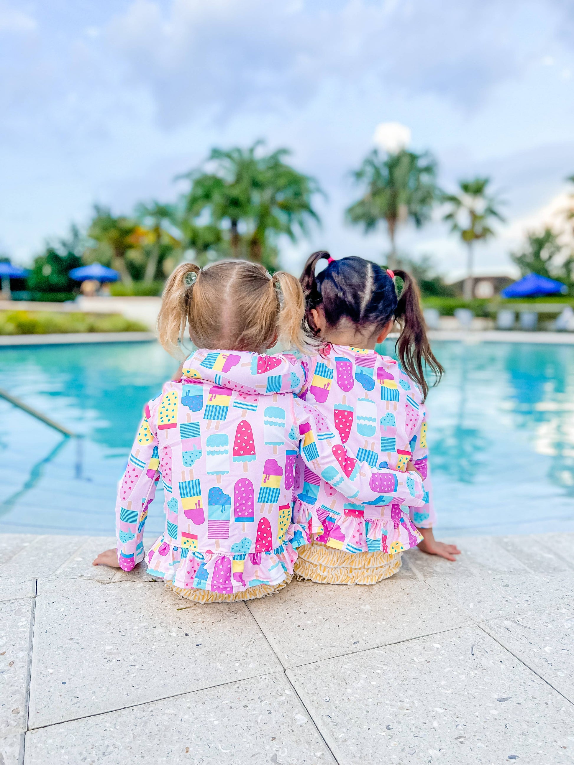 Girls Ice Cream Social Long Sleeve Ruffle Hem Rash Guard 2-Piece Swimsuit with Signature Rear Ruffles