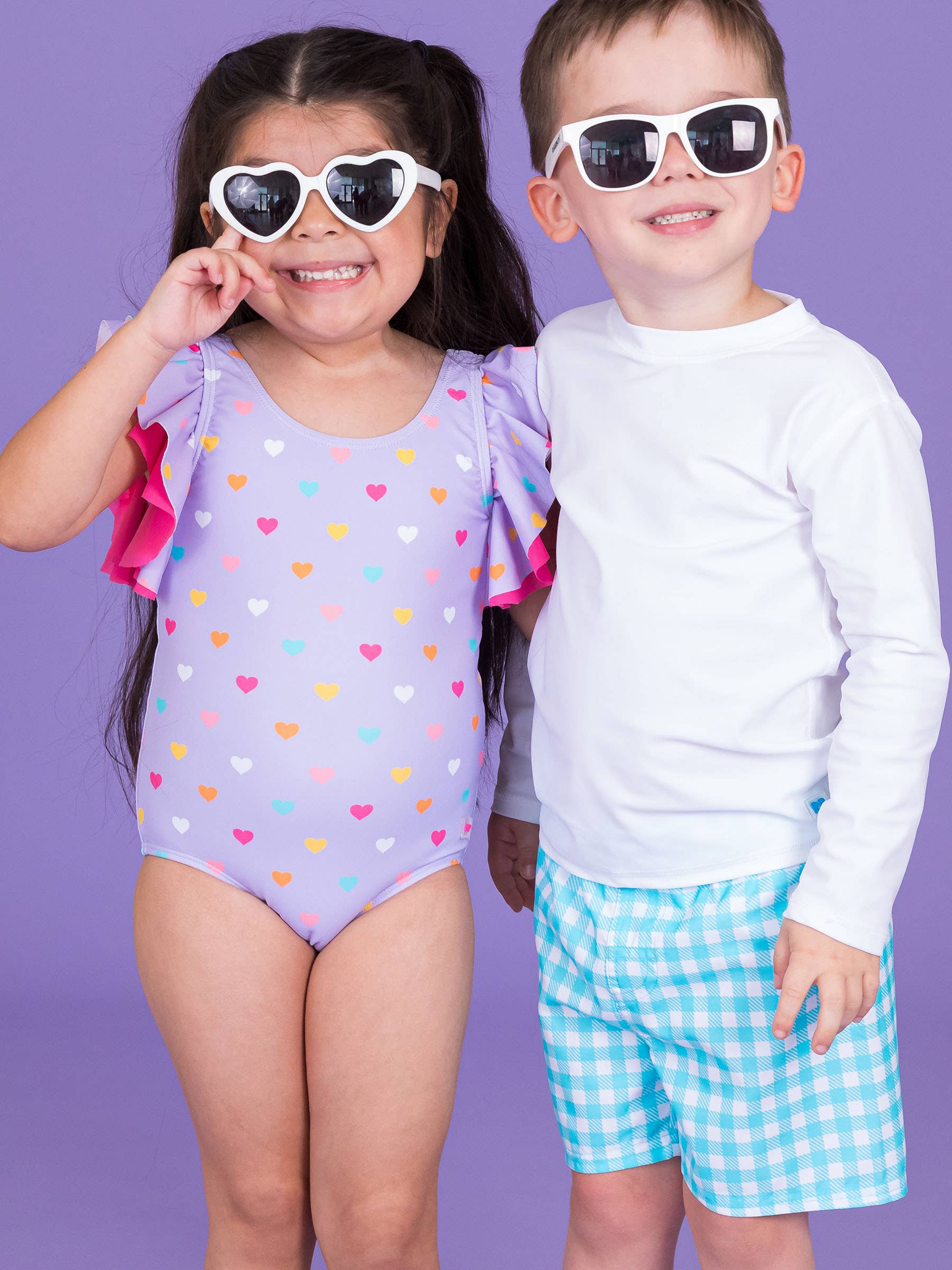 Our butterfly sleeve swimsuit with stylish flutter sleeves is perfect for a vacation or a day in the water. This one piece is made with UPF 50+ sun protected fabric for optimum play time in the water. The bestselling heart pattern is a hit with girls of all ages!