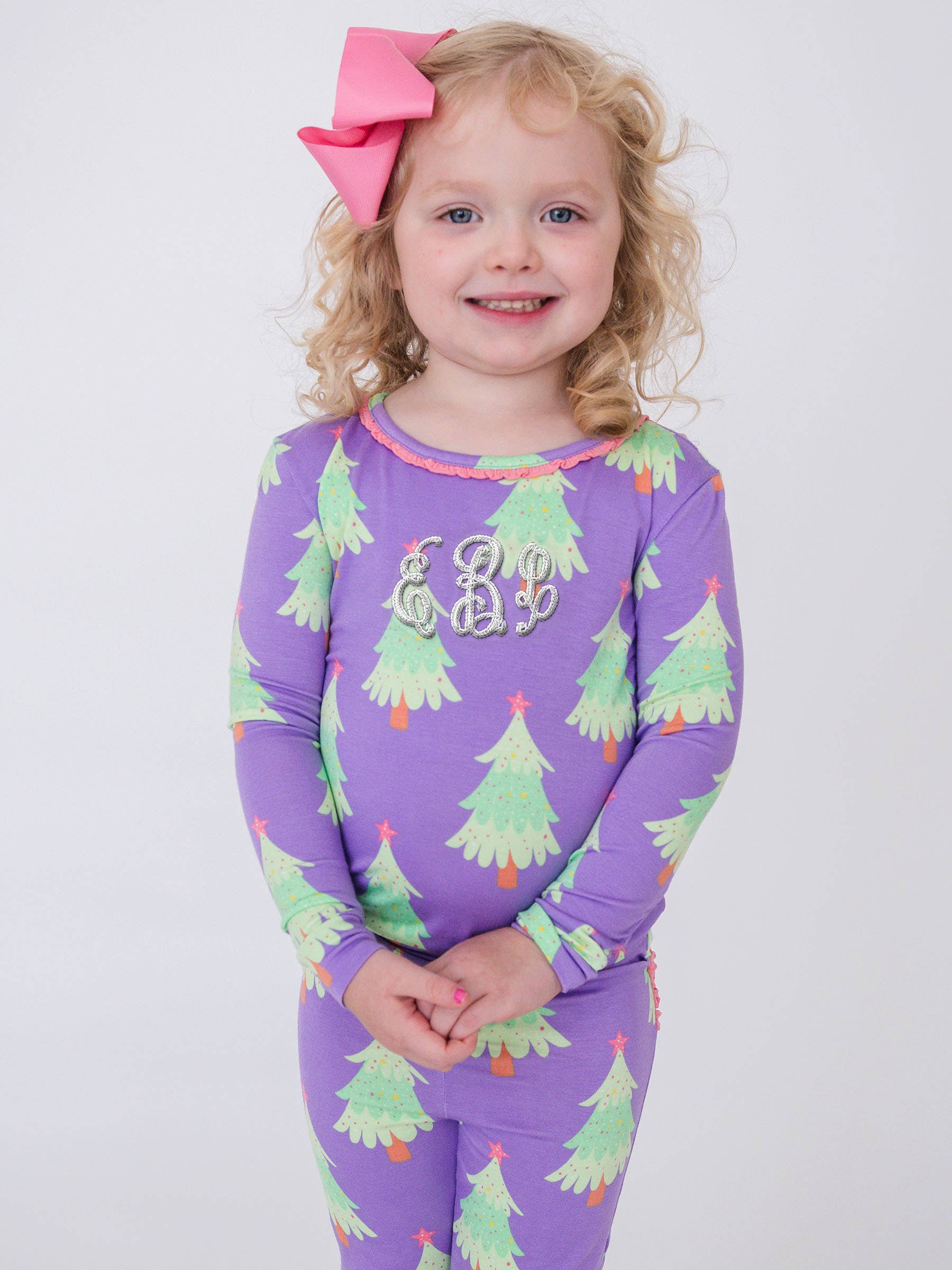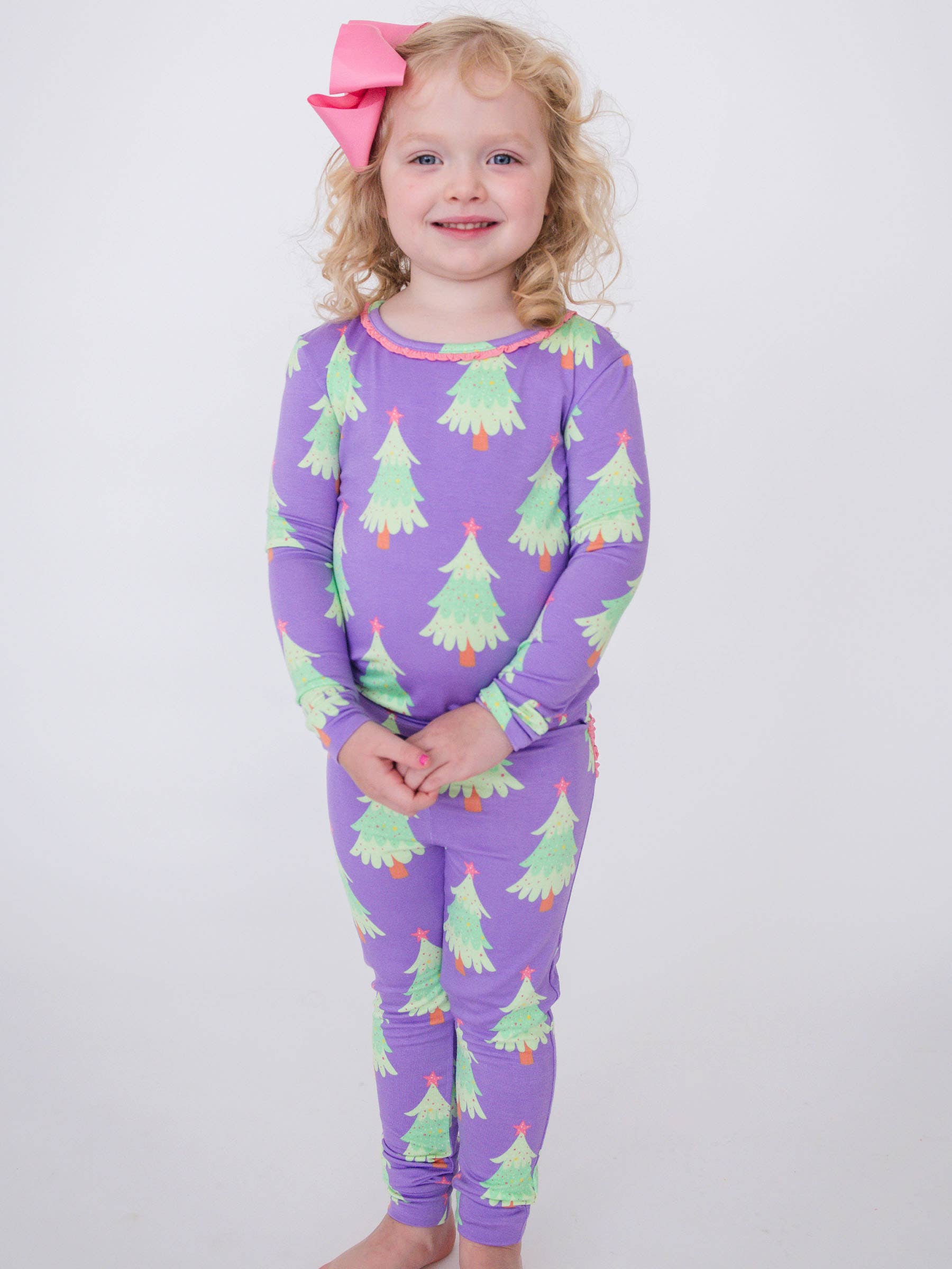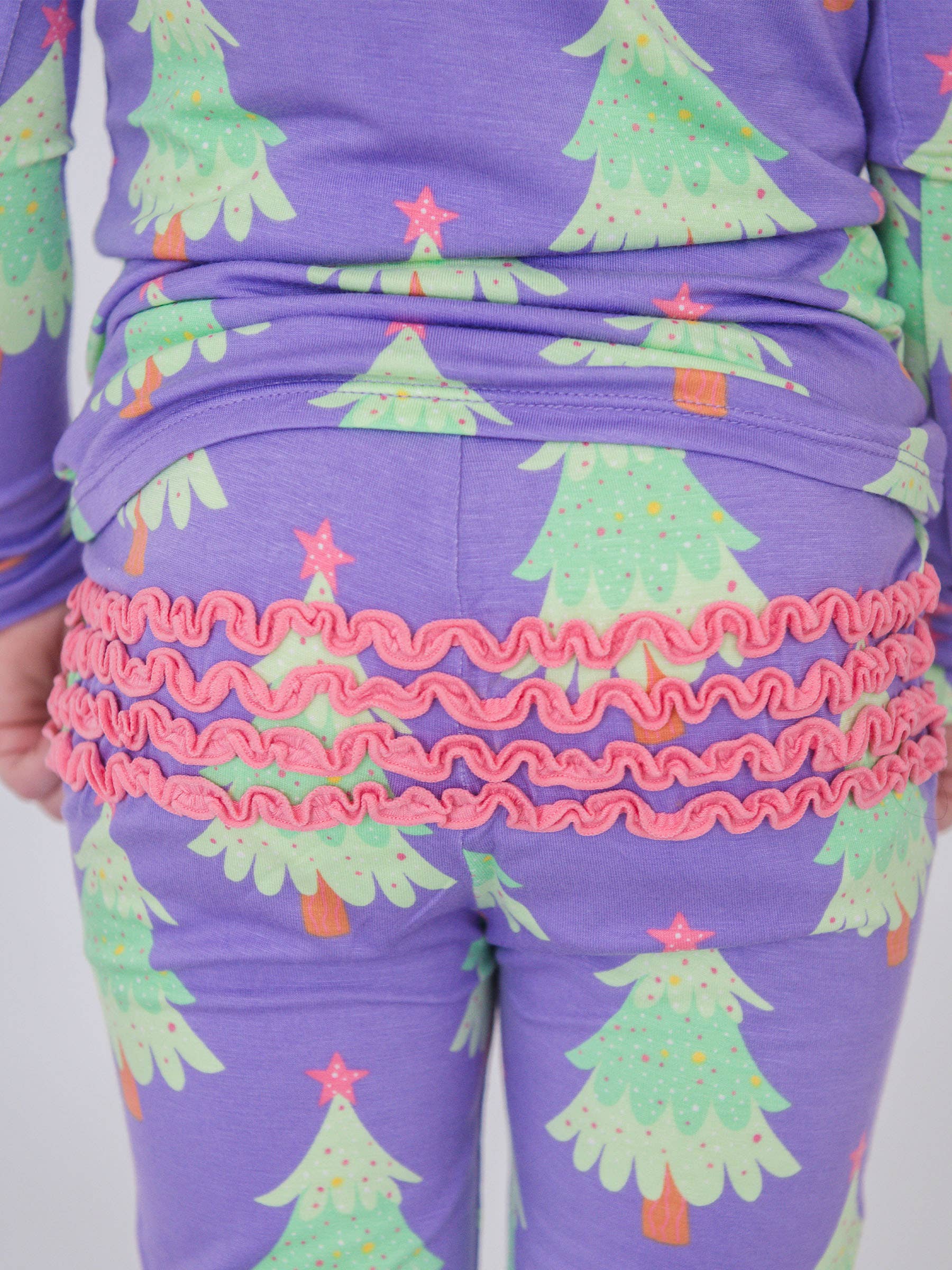 SoftSnooze™ Toddler Girls Bamboo Viscose Purple Twinkling Trees Ruffle Long Sleeve Pajama Set with Signature Rear Ruffles