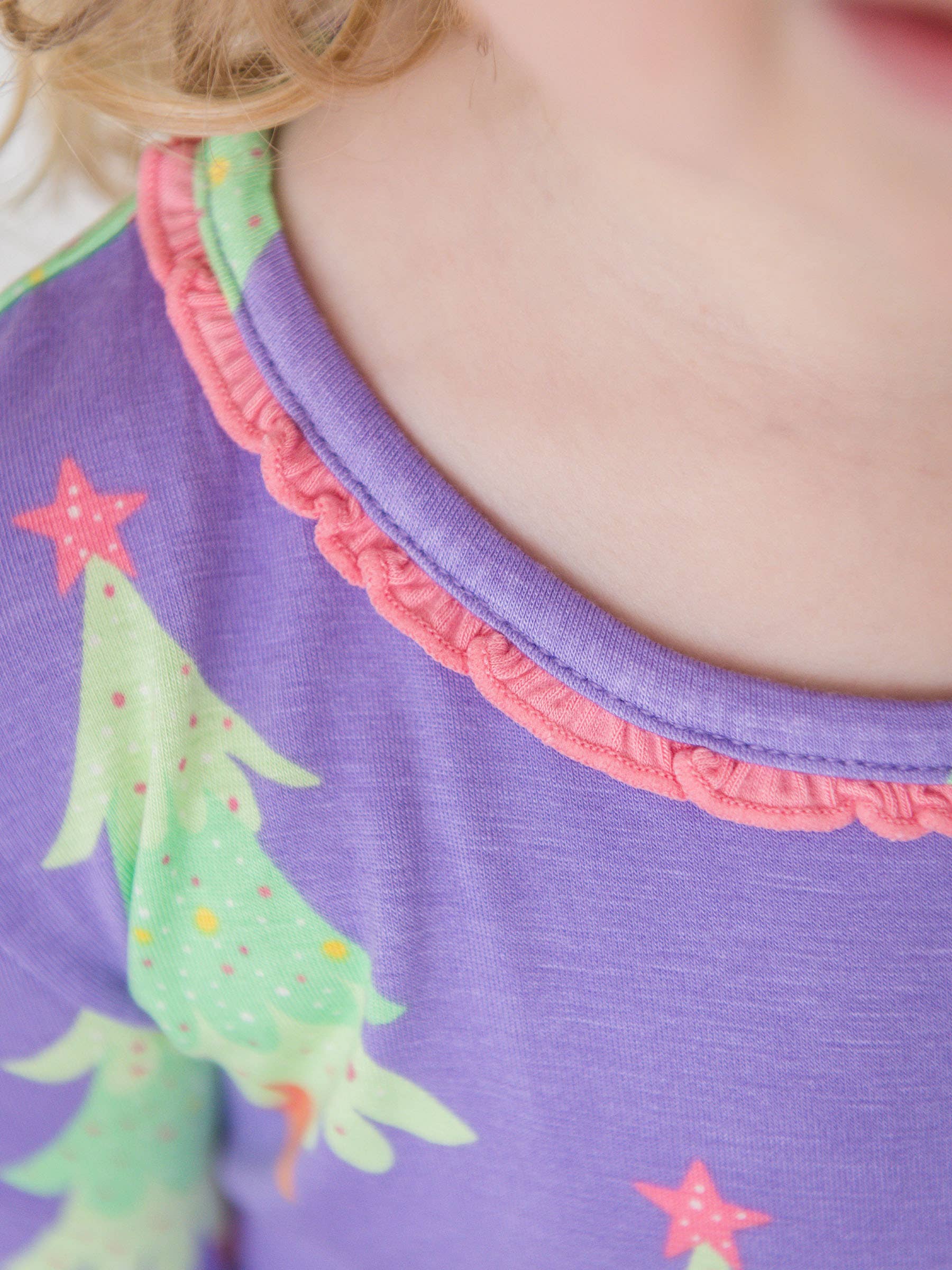 This long sleeve sleep set is soft and cozy, with precious ruffles that will bring a smile to your face. A dainty ruffle adorns the neckline of the pajama top, and classic rear ruffles add the finishing touch. Tagless for added comfort. Made from our premium SoftSnooze™ bamboo viscose fabric, these jammies are super snuggly, breathable, and gentle on sensitive skin. Perfect for keeping cozy in the winter yet cool in the summer. The grow-with-me stretch means growing little ones can wear these pajamas for longer! A festive Christmas tree adorned with a bright golden star topper is sure to get you into the holiday spirit!